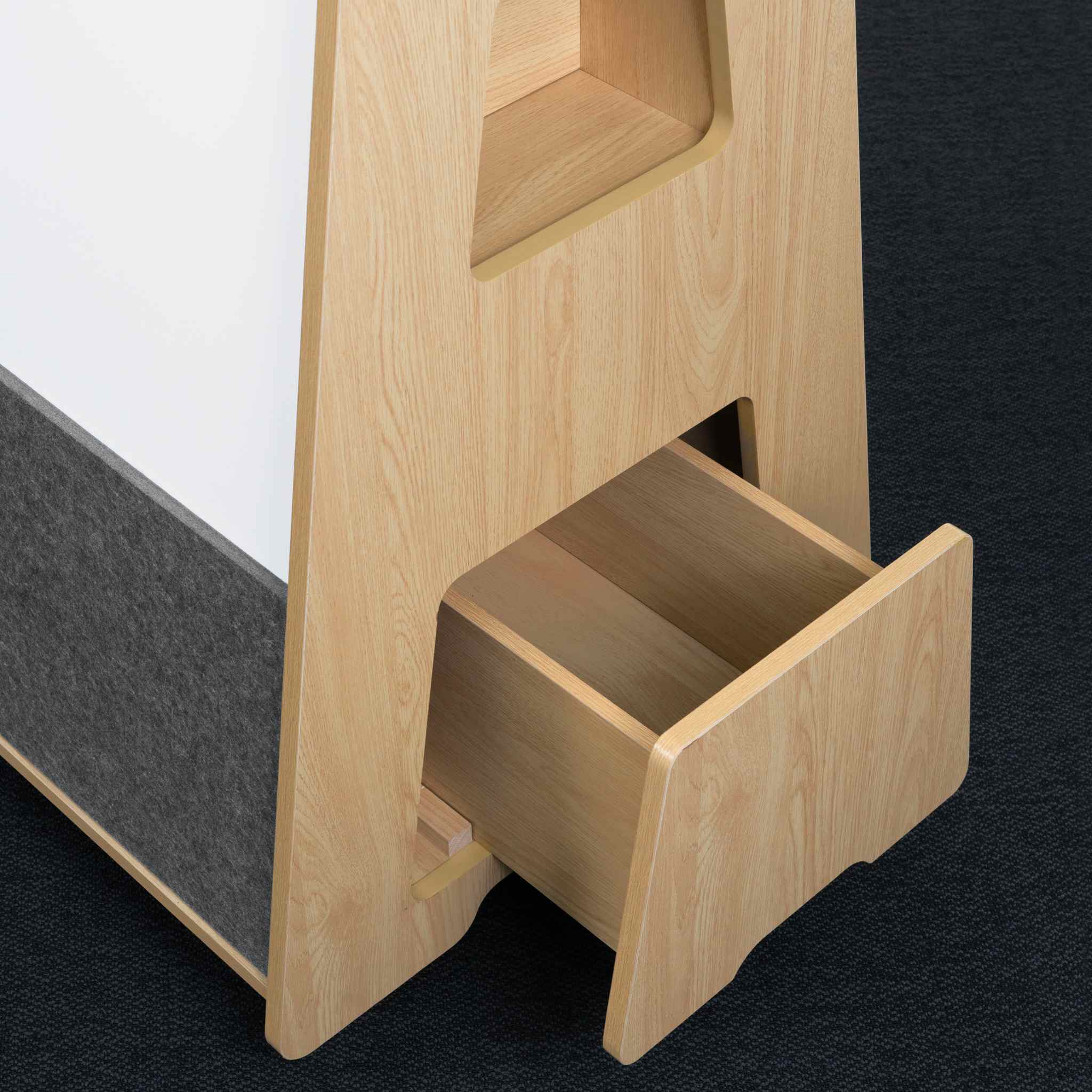 Featuring an A-frame design in a wood finish. Offering two large writing surfaces and a magnetic receptive acoustic pinboard base. Store away tools and accessories in the side drawers and storage cubby holes.